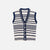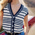 This is a sleeveless knit vest in a natural beige tone with contrasting brown crochet-style trim along the V-neckline, armholes, front placket, and pocket edges. The vest features a button-down front with horn-style buttons and two front patch pockets, adding both function and charm. The knit has a textured, handcrafted feel that enhances its casual yet refined look.