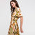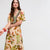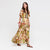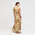 This maxi dress showcases a vibrant tropical print in warm earthy tones. Designed with a deep V-neckline, flutter sleeves, and a gathered waist, it offers a flattering silhouette in a lightweight fabric that moves with ease. Perfect for holidays, summer occasions, or effortless day-to-night style.